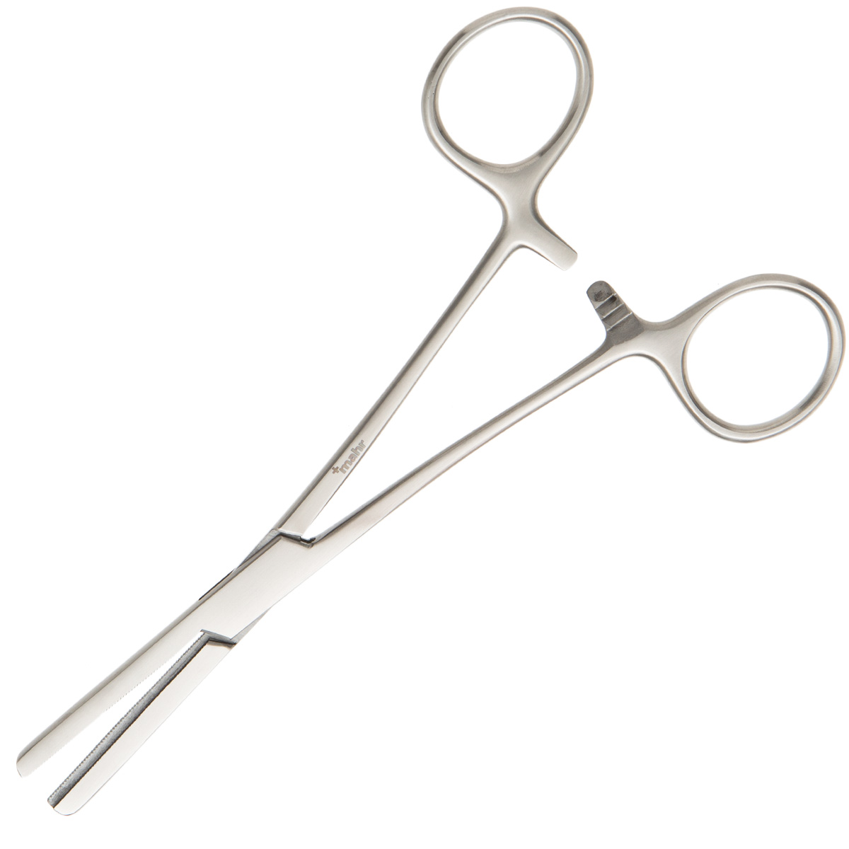 Heavy duty scissor-type forceps with ratchet handles and blades faces that are cross-hatched and have a matching longitudinal male-female groove running their length. Designed for hemostasis and prevention of subsequent bleeding. They are available straight or curved, and in two sizes.