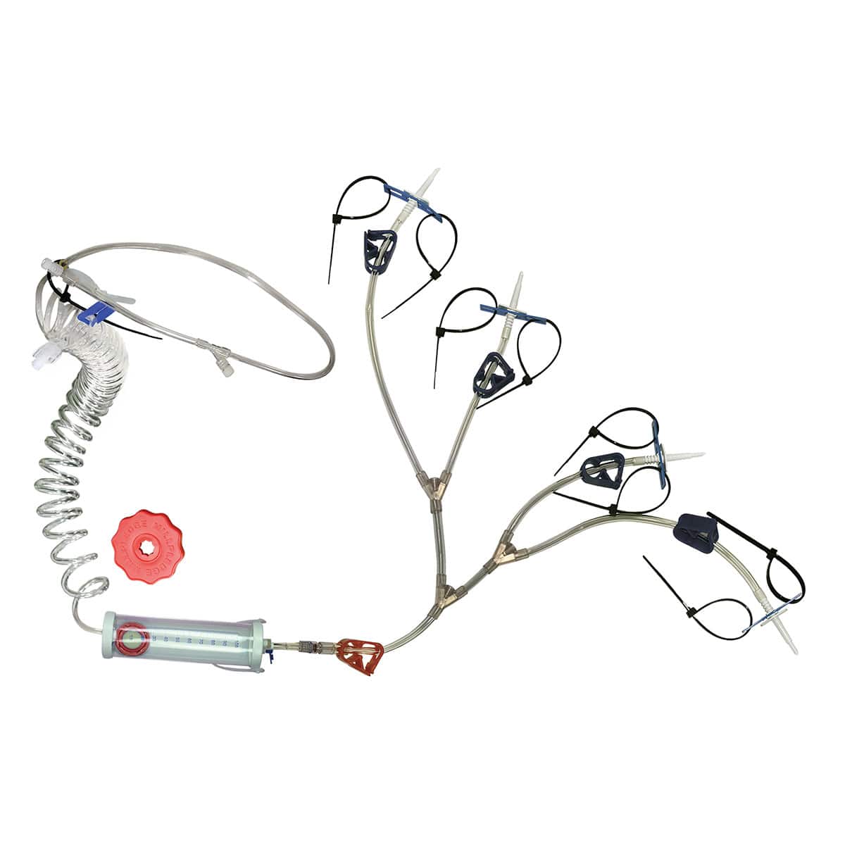 - On each delivery arm of both sets is a blue shut-off C-clamp that allows you to manage how many IV fluid containers are flowing at any given moment.