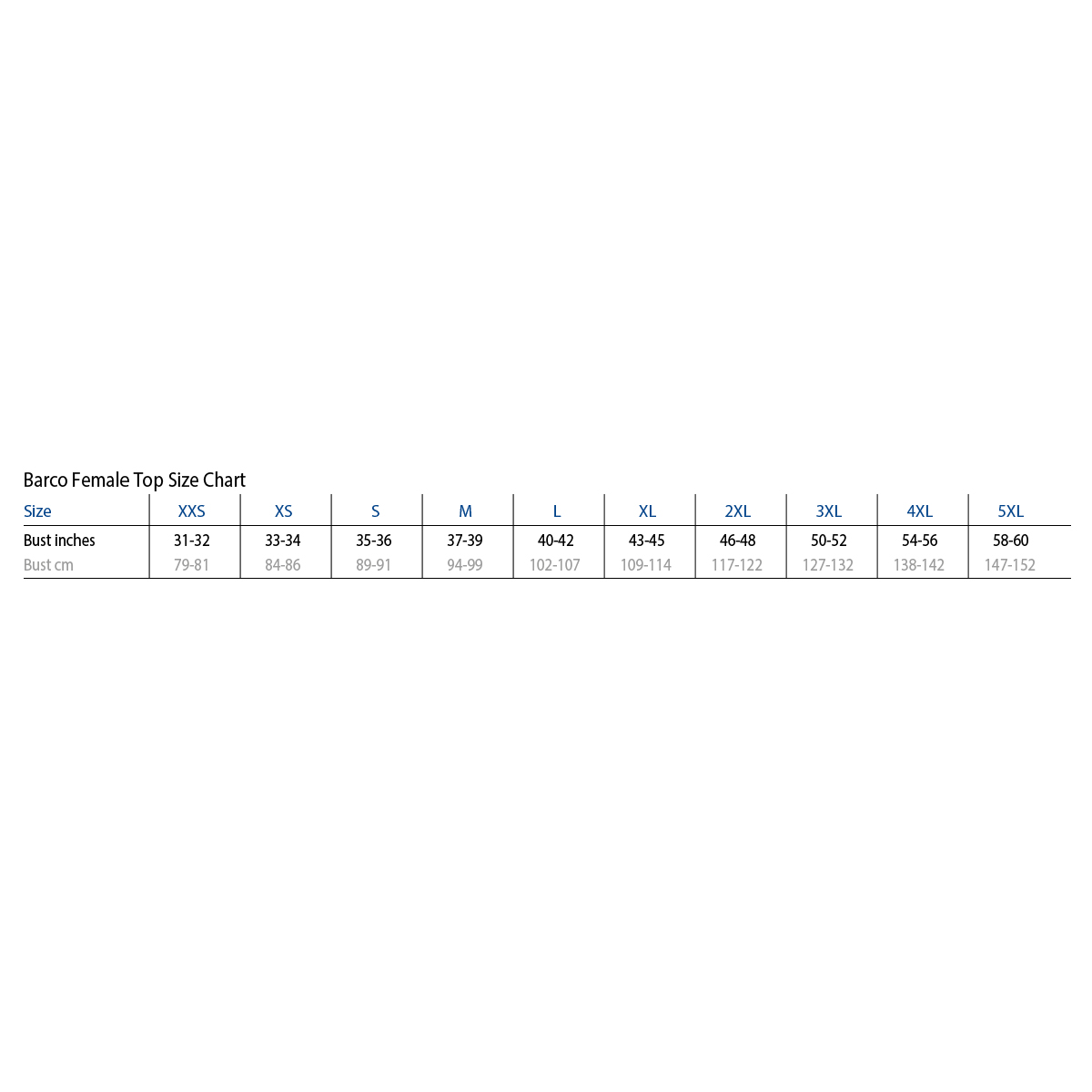 | BA5105/ROYA/XL | Barco Female Racer Top (BA5105) | Royal Blue | XL (43-45") | £32.99 |