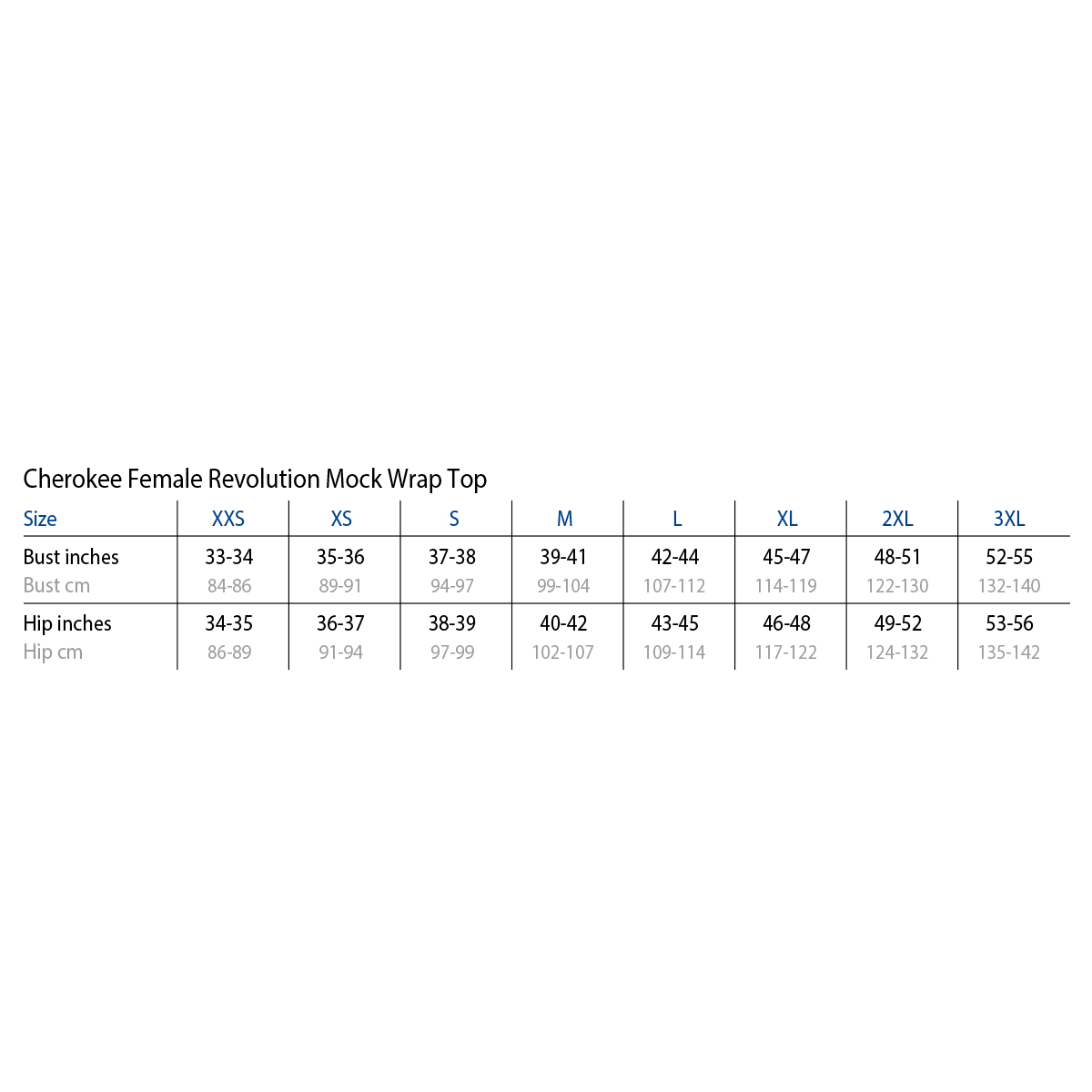 Cherokee Revolution Mock Wrap Top Size Chart