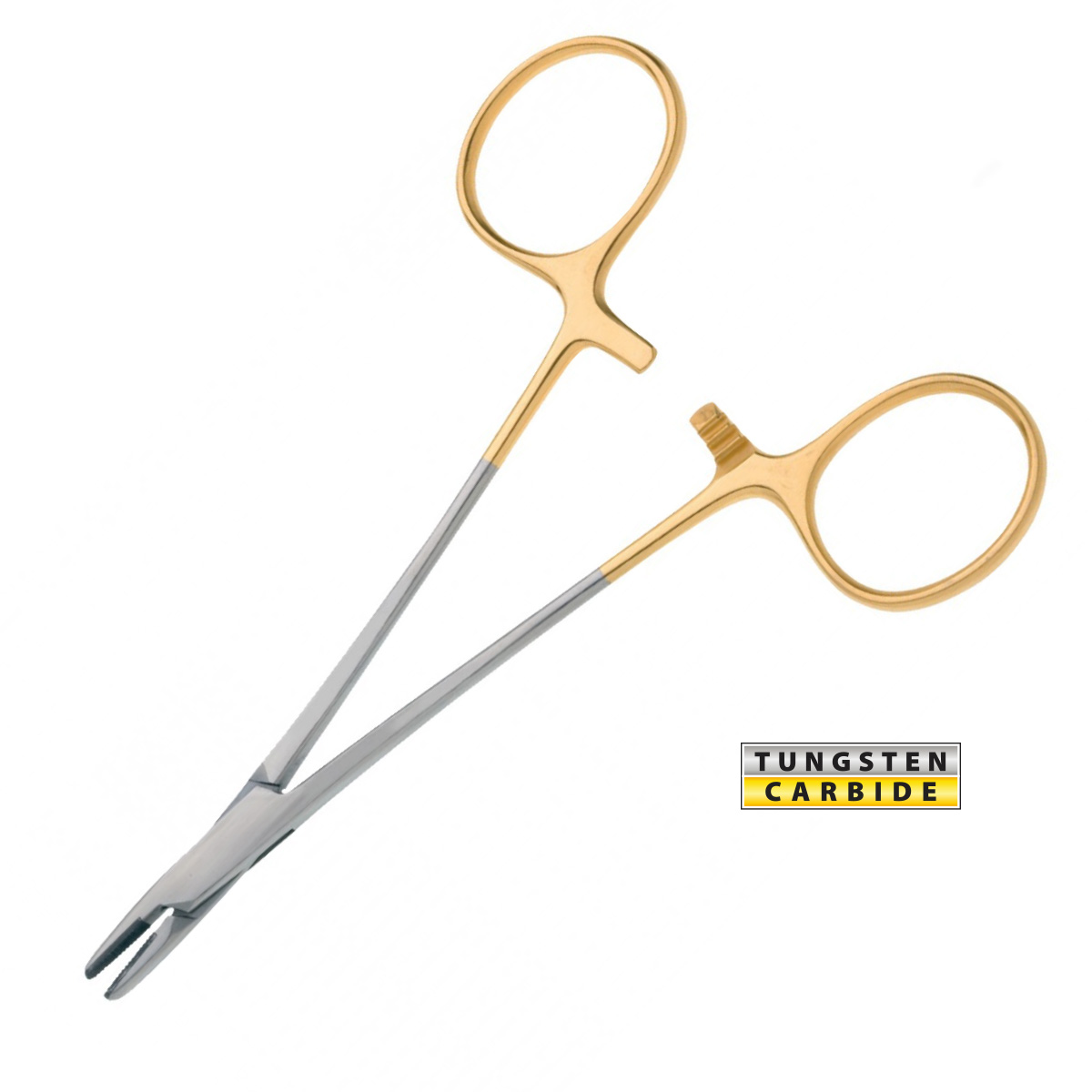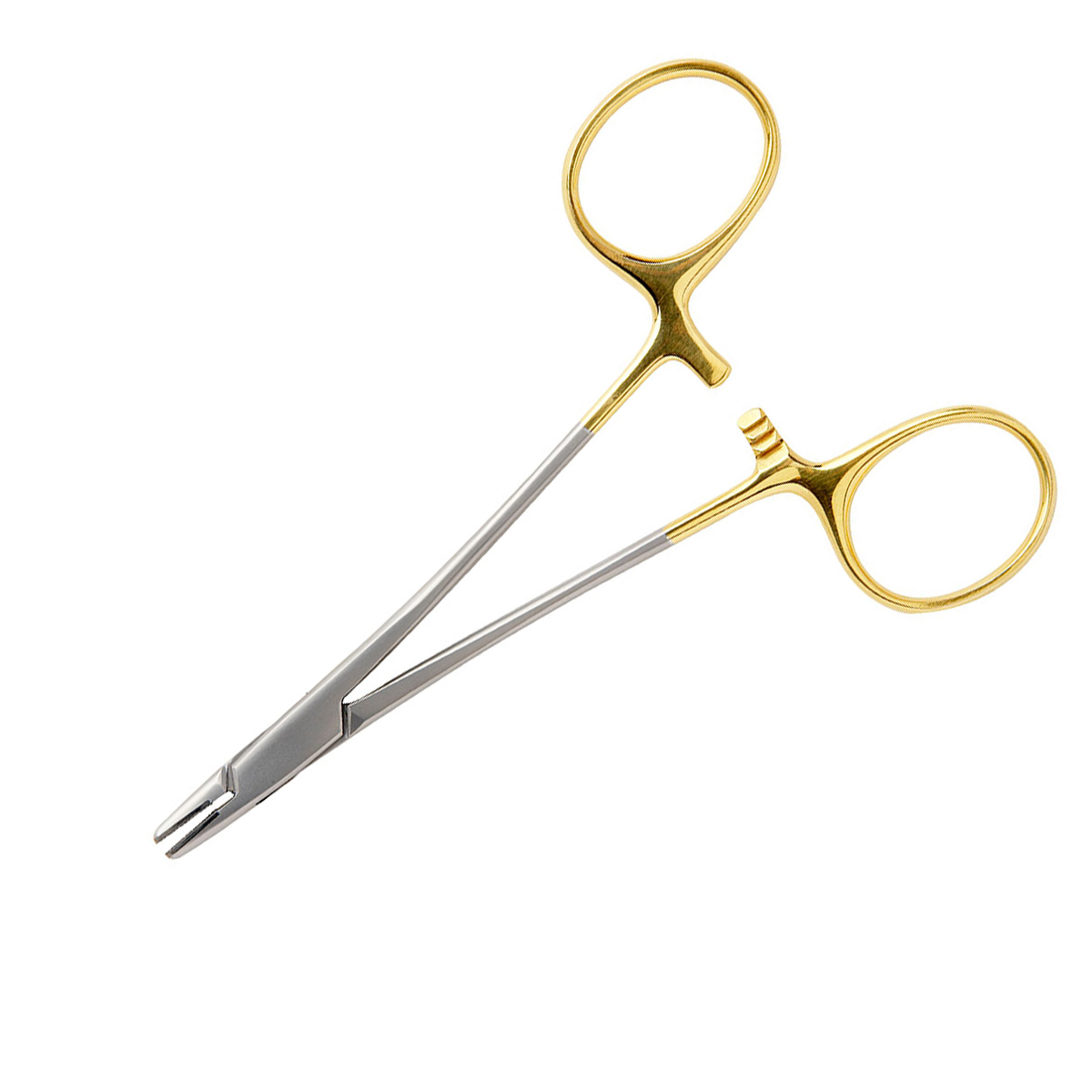 The Derf Needle Holder has short jaws and delicate serrations that accommodate smaller needles as well as 5-0 and 6-0 sutures. This ratcheted instrument is straight with serrated ends and a central groove, and its shorter length makes it easier to handle in limited surgical sites.
