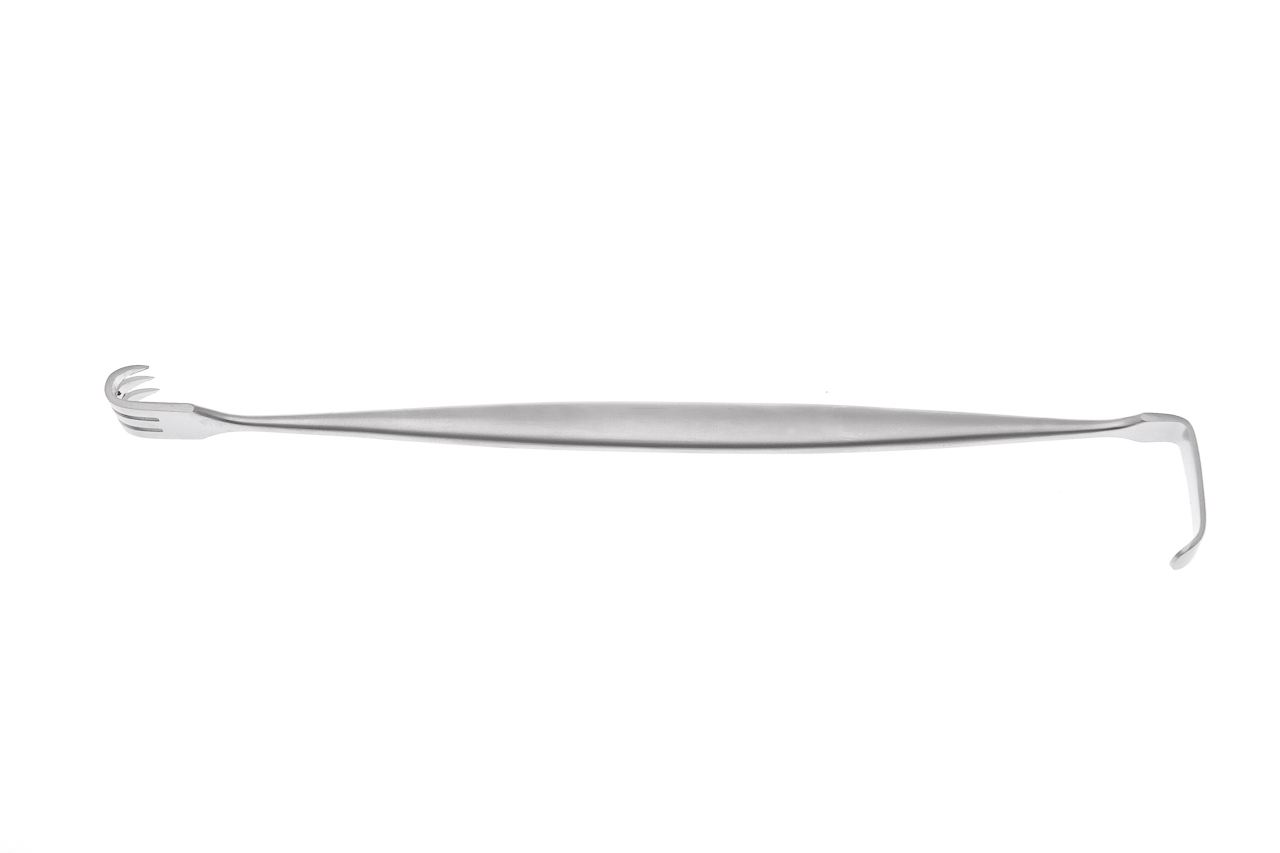 The Kilner Catspaw Retractor features a double-ended design for retracting surface tissue. Surgeons frequently use it in cosmetic surgery, as well as small bone and joint procedures. This instrument has one angled, blunt end and a three-prong, sharp rake point on the opposite end facing the opposite way.