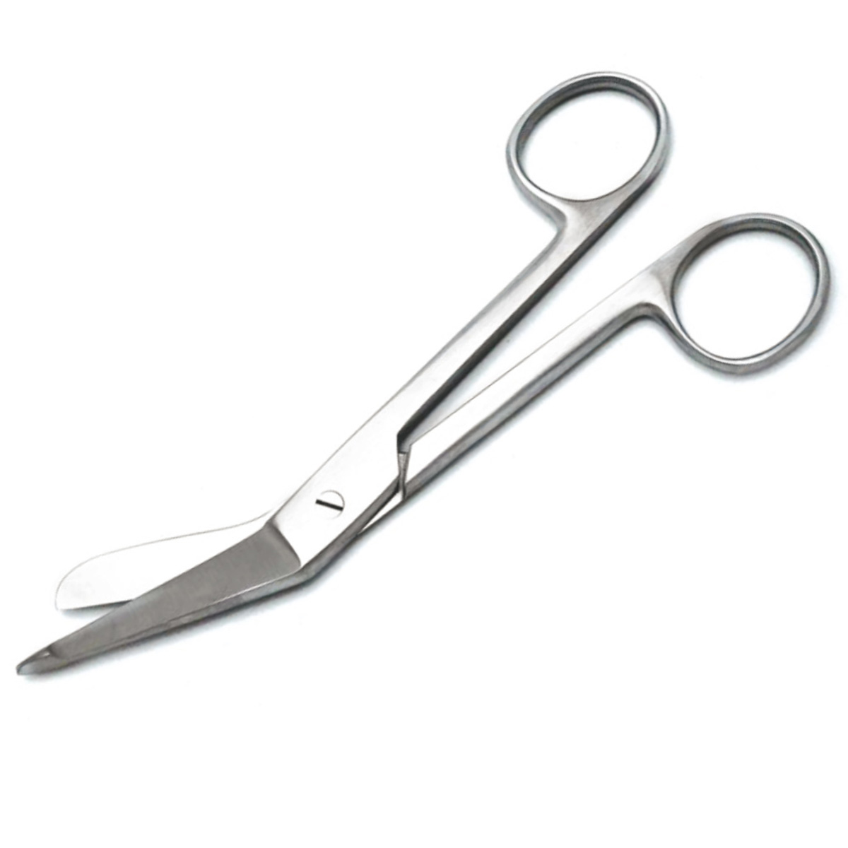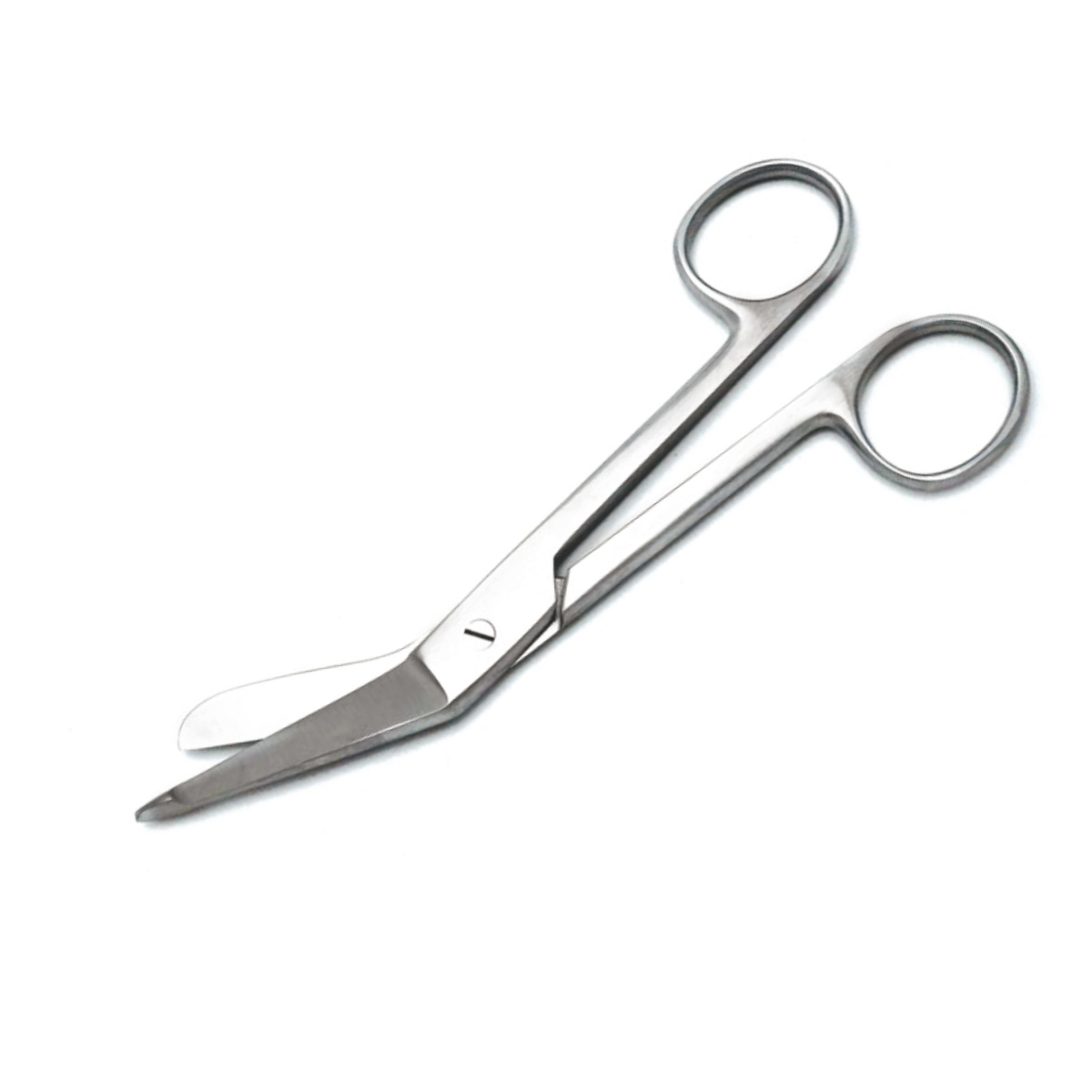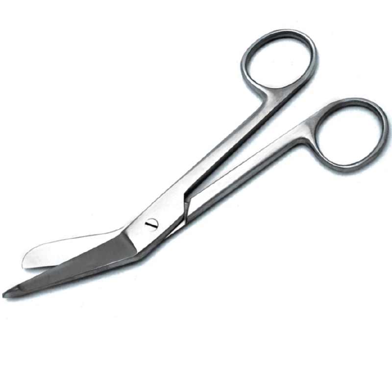 These are angled tip scissors with a blunt tip on the bottom blade, which helps in cutting bandages and other dressings taped or adherent to the skin surface, without causing skin damage.