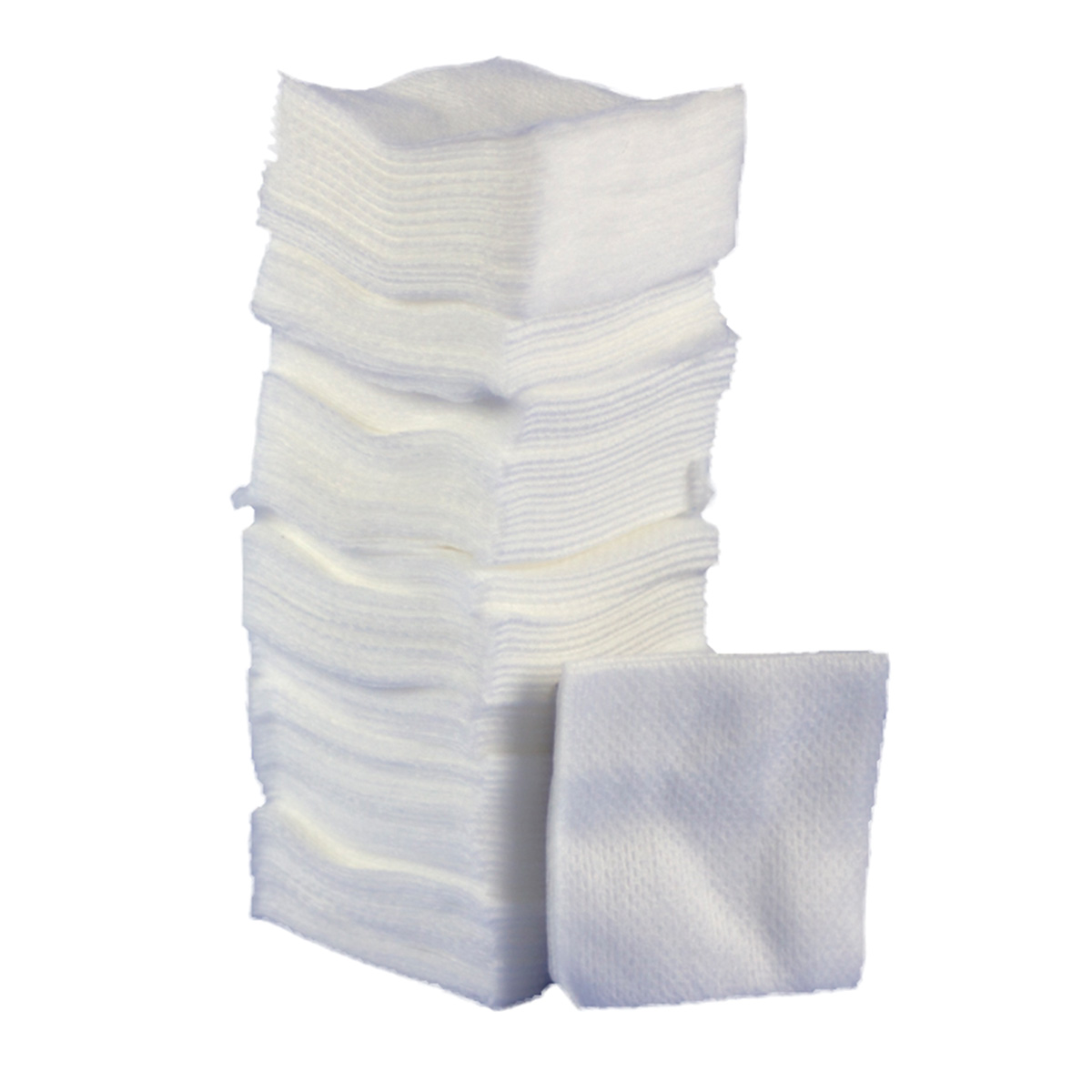 Millswab non-woven fabric made of randomly stacked viscose fibres fused and bonded together, cut and folded into 4-ply (layers) thickness gauze swabs.