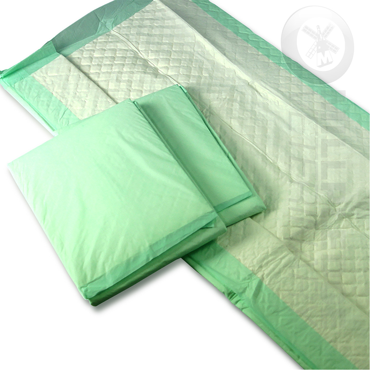 Surgical or incontinence underpads of thick, highly absorbent fluffed cellulose filling, with strong porous material upper cover, bonded around all edges to a light soft green waterproof plastic backing.