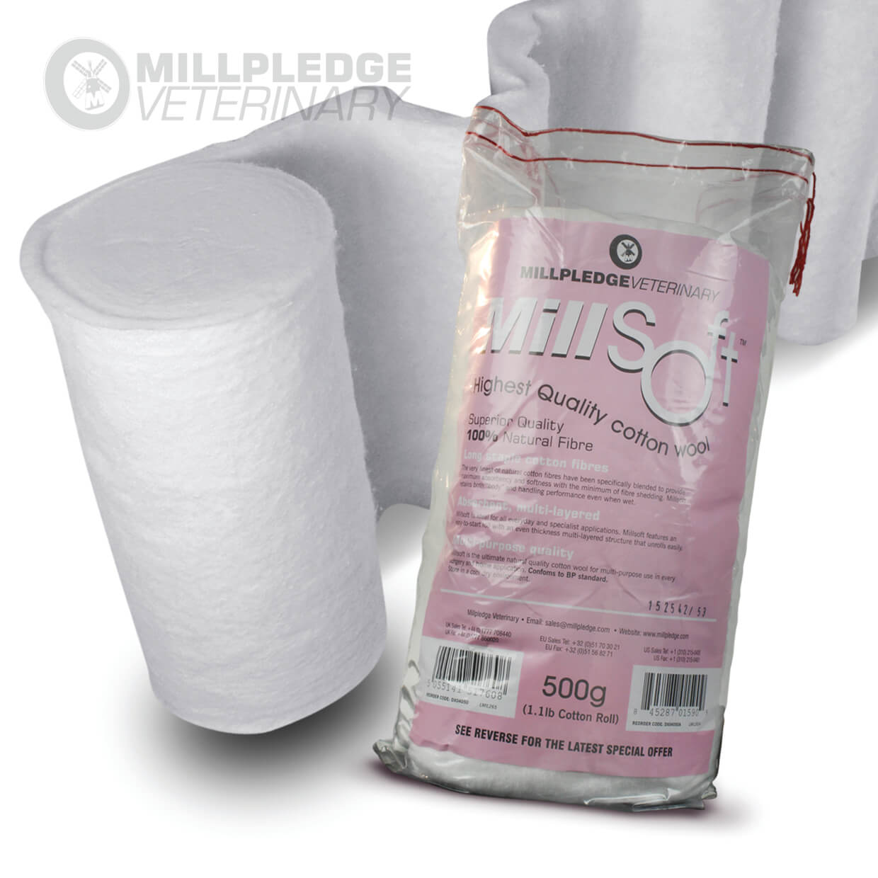 Superior quality 100% natural fibre. The very finest of natural cotton fibres have been specifically blended to provide maximum absorbency and softness with the minimum of fibre shedding. Millsoft retains both ‘body’ and handling performance even when wet. Millsoft is ideal for all everyday and specialist applications. Millsoft features an easy-to-start roll with an even thickness multi-layered structure that unrolls easily. Millsoft is the ultimate natural quality cotton wool for multi-purpose use in every surgery and home application. Conforms to BP. Standard. No need for a paper interleave.