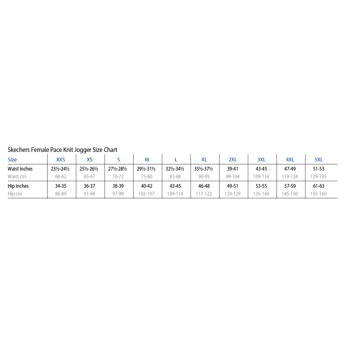 | SKP669P/ROYA/XXS | Skechers Pace Female Slip-In Joggers (SKP669) | Royal Blue | XXS (31-32") | Small (27") | £33.99 |
