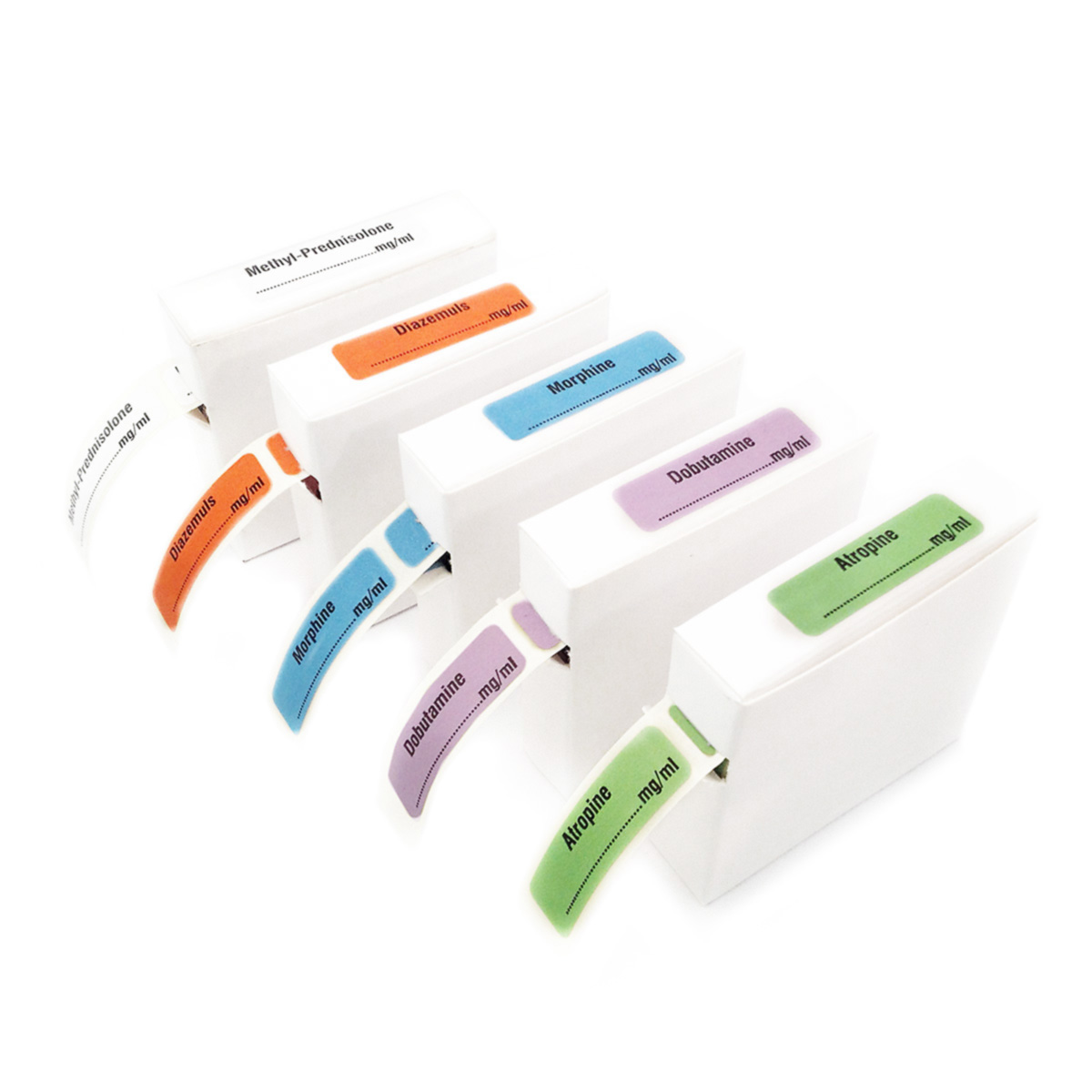 Drug labels designed to mark syringes for identification of drug content. Reducing the possibility of medication errors, drug (and syringe) waste and timewasting. Featuring a high-impact colouring and allowing clear visibility of dose marking on the syringe.