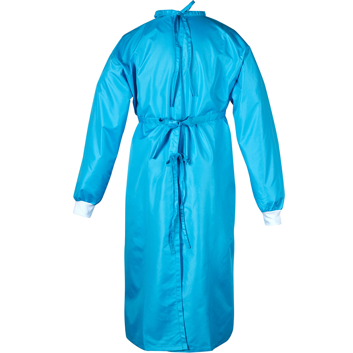 Reusable gowns are constructed of 100% machine washable polyester with a fine PU coating for water repellence. This is a soft, durable fabric that is non-iron and perfect for various types of garments. The pieces are breathable, and the material weighs 145gsm. The washing recommendations provided below are just intended to serve as a reference and to extend the life of the water repellent coating.