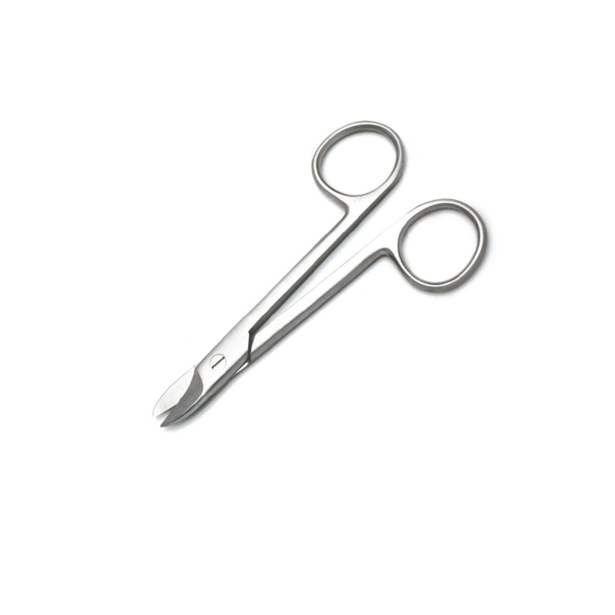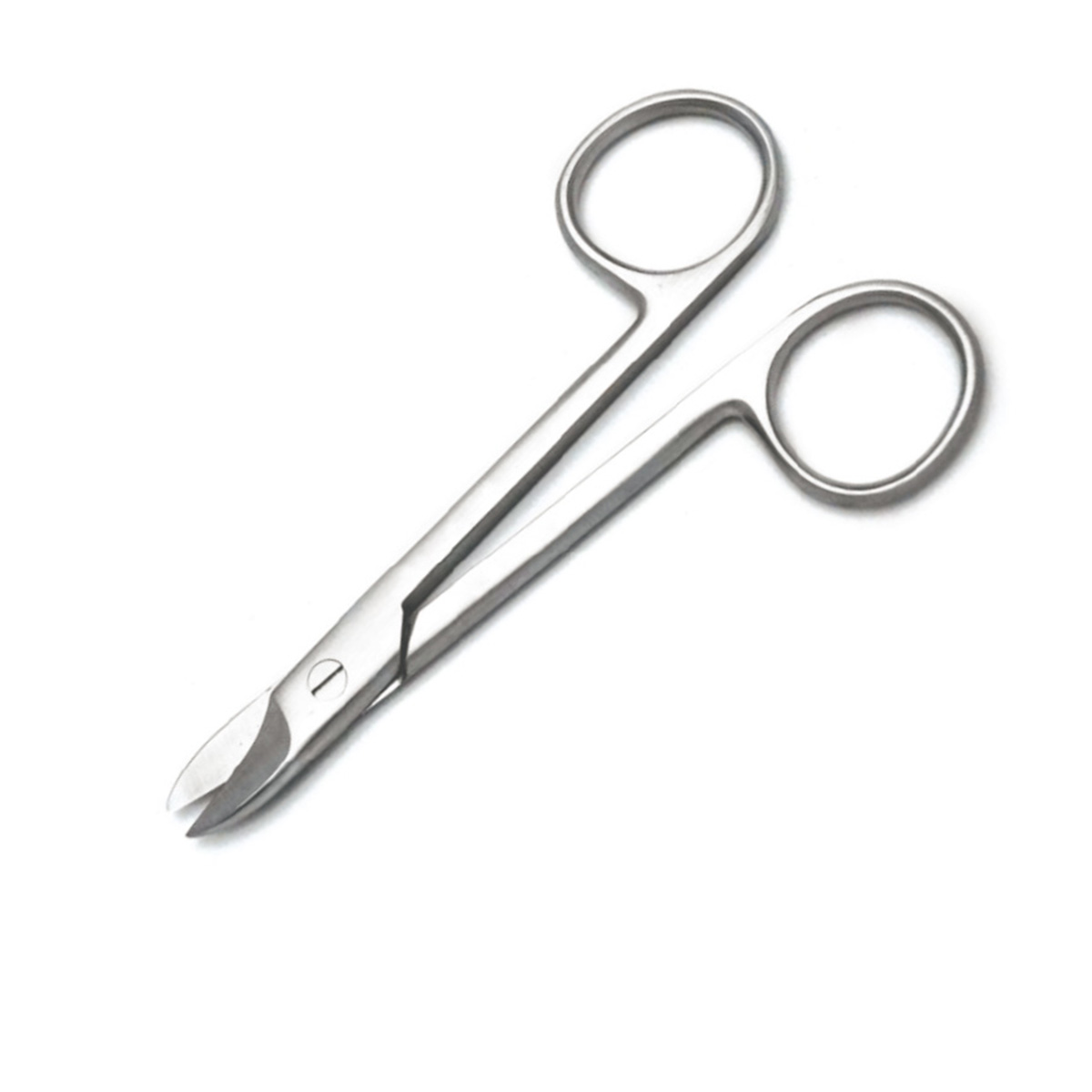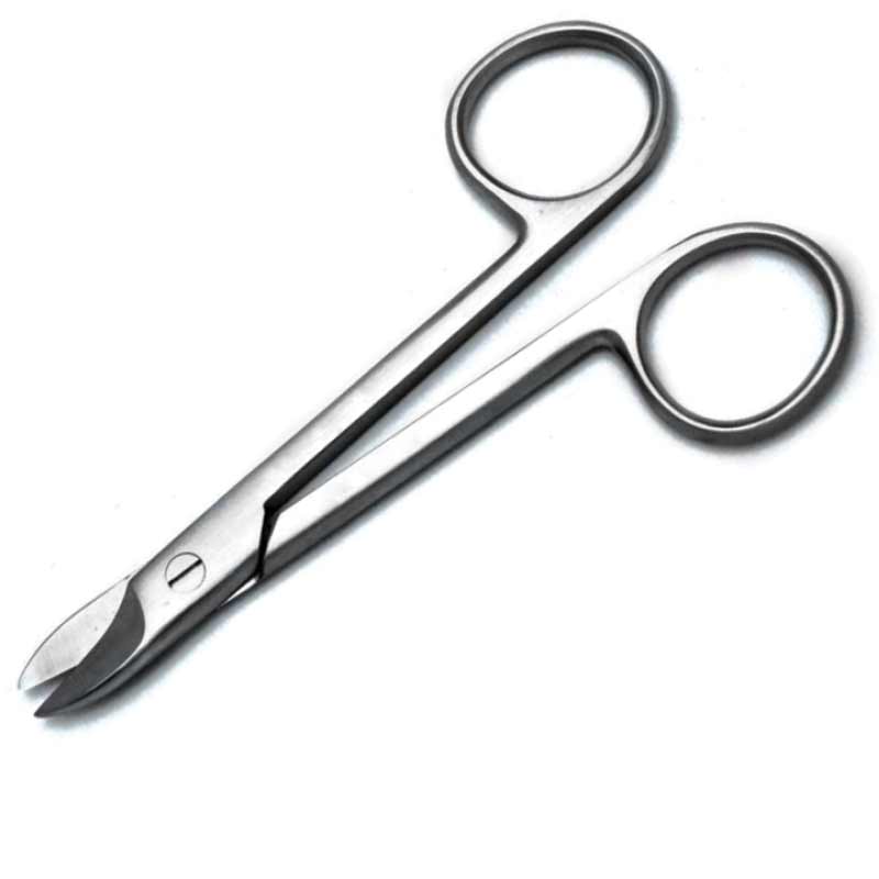 Finger ring scissors used for cutting surgical wires. This product has straight shanks with serrated jaws.