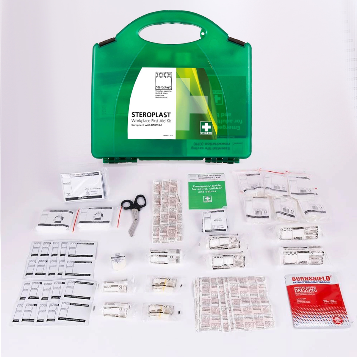All Kit in Premier Box (BS8599-1)The definitive workplace first aid kit in a premier box, ideal for small business settings. Made to BS8599-1 specifications to offer businesses the required level of quality to comply with health and safety laws in the UK. From a brand endorsed by the NHS and emergency services.